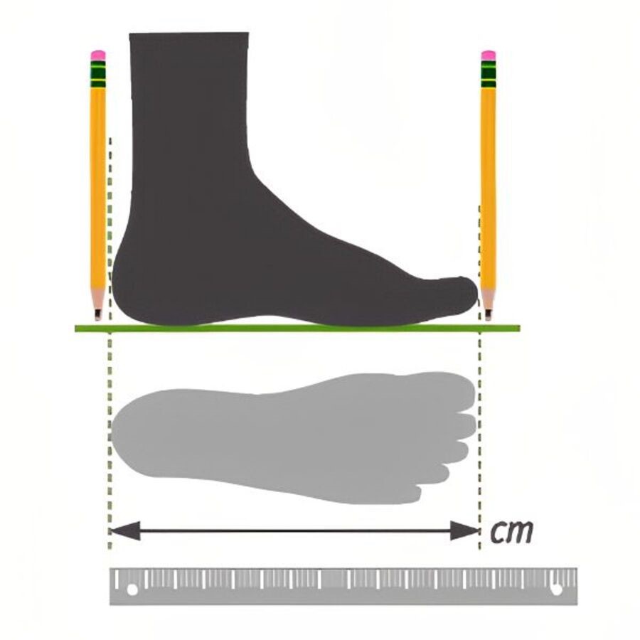 بهتره این کار را عصر انجام بده چون پا در طول روز کمی ورم می‌کند.مطابق تصویر زیر پشت پاشنه و جلو انگشت شصت رو با خودکار علامت بزن، سپس فاصله بین دو علامت رو با متر یا خطکش اندازه بگیر و بر اساس جدول زی سایز پاتو تعیین کن.